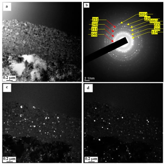 Electron microscopic image of the surface layer structure of Al-20%Si formed as a result of the two-stage treatment which combines electroexplosive alloying by yttrium oxide powder and subsequent irradiation with a pulse electron beam; (a) bright-field; (b) X-ray diffraction pattern; (c,d) dark-field images obtained in reflections [204]YAl3 and [211]Y2Si2O7 (c); [1013]YAl3 and [251]Y2Si2O7 (d); in (b) diffraction rings are shown in which dark-field images were obtained: 1—for (c), 2—for (d). Yellow arrows indicate diffraction rings belonging to the YAl3 phase; red arrows indicate diffraction rings belonging to the Y2Si2O7 phase.