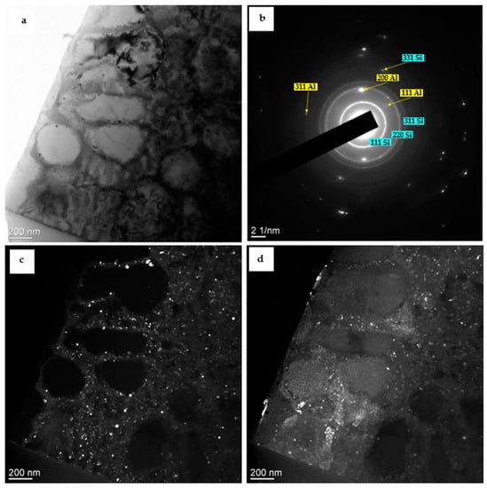 Electron microscopic image of the intermediate layer structure of Al-20%Si formed as a result of the two-stage treatment which combines electroexplosive alloying by yttrium oxide powder and subsequent irradiation with a pulse electron beam; (a) bright-field; (b) X-ray diffraction pattern; (c,d) dark-field images obtained in reflections [220]Si (c) and [200]Al (d).
