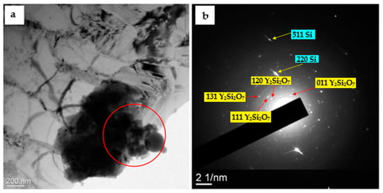 Electron microscope image of the intermediate layer structure of Al-20%Si formed as a result of the two-stage treatment which combines electroexplosive alloying by yttrium oxide powder and subsequent irradiation with a pulse electron beam; (a) bright field; (b) microelectron diffraction pattern obtained from the foil section limited by the selector diagram (red circle in Figure 5a).