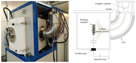 Hydrogen-free ta-C coatings were deposited on commercial tungsten carbide inserts (Canela Tools, SPUN 120308E PM25) using the cathodic vacuum arc deposition system shown in Figure 1 (Eurecat-Tratamientos Térmicos Carreras S.A.). In order to reduce the incorporation of detrimental microparticles in the growing films, the system is provided with a DC filtered cathodic arc source (Plasma Technology Limited, Hong Kong, China), where the generated arc plasma is guided into the vacuum chamber by an electromagnetic field applied to the curved duct.