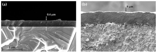 Cross-section SEM images of: (a) ta-C coating; (b) PCD coating.