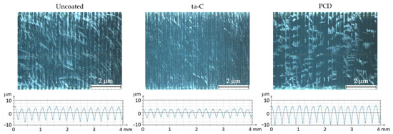Optical microscopy images and height profiles corresponding to the turning finish obtained using un-coated, ta-C-coated and PCD-coated inserts.