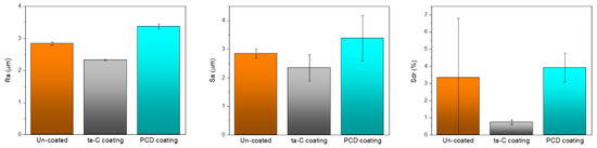 Roughness parameters Ra, Sa and Sdr of machined parts using un-coated, ta-C-coated and PCD-coated inserts.