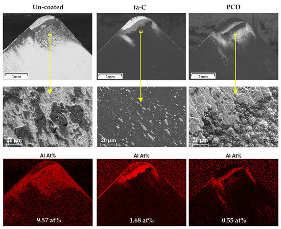SEM images of the cutting edge of the tested inserts taken at the rake face, and their corresponding mapping distribution of total atomic content of the adhered aluminium.