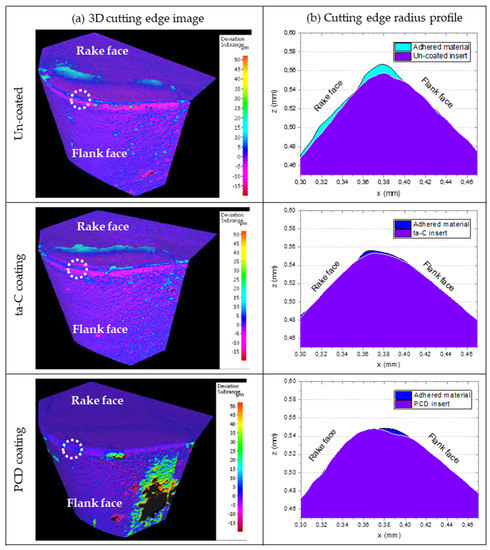 The high roughness of parts machined with PCD inserts could be attributed to the high irregular topography of the coating displayed at the cutting surface of the tool, as shown previously in Table 2. This phenomenon is more evident in the 3D images obtained at the cutting edge of the worn inserts and their respective cross-section profiles (Figure 7). These images were acquired automatically by comparing the reference geometry (insert in the initial state) with the worn tool (Figure 7a). Form deviations are clearly visible by advanced color visualization scale, where the violet color indicates the reference geometry, the bright cyan color indicates the adhered material with a thickness between 10 and 20 µm, and dark blue shows the adhered material between 5 and 10 µm. The 3D images show that un-coated and ta-C inserts presented more adhered material in the rake face, as previously observed in SEM images, whereas in the flank face the maximum worn material was around 5 µm in depth, as indicated by the magenta-colored area. In contrast, the most affected area in PCD inserts was the flank face, with a large amount of adhered material, in some cases reaching a thickness of up to 50 µm.