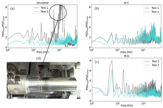 Ratio between the final and initial Power Spectral Density (PSD) of (a) un-coated, (b) ta-C coated, and (c) PCD-coated inserts. (d) Un-coated tool forming a large chip around the machined component.