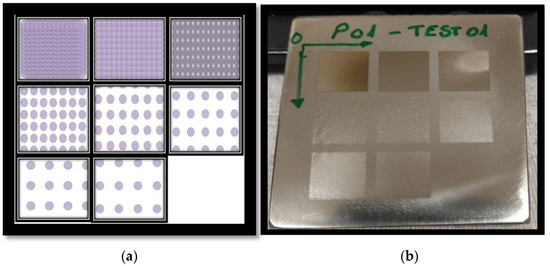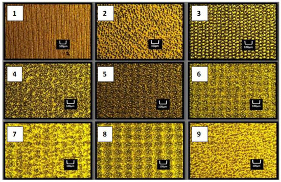 Figure 1a shows the schematic representation of variation in dimple density and Figure 1b shows the actual metal samples used for the tests. In addition, the optical microscopic images of the samples are shown in Figure 2. In this work, a nanosecond laser was used for the irradiation of the textures, which implied that some thermal effects modified the size and geometry of the dimples. This effect was mainly related to the energy density of pulses and the scanning speed of the beam used in the irradiation treatments. The variability between the theoretical (Figure 1a) and real geometries (Figure 2) of the textures was due to the accumulation of solidified material at dimple boundaries and material removal.