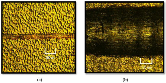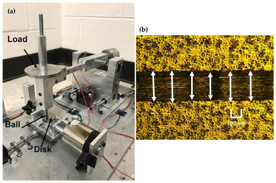 Tribological tests were performed to calculate the friction coefficient and wear on the titanium textured surfaces against 1.5 mm diameter tungsten carbide balls. A custom-made reciprocating ball-on-flat tribometer (Figure 3a) was used to conduct the tests using PAO as a lubricant. Each test was performed under the same operating conditions, with a normal load of 5 N, which corresponds to a maximum contact pressure of 3.8 GPa. The frequency used was 2 Hz with a stroke length of 3 mm and a total sliding distance of 50 m. After performing the friction tests, wear tracks were analyzed using an OLYMPUS B-2 optical microscope (Olympus, Tokyo, Japan). Volume losses were determined from the mean value of the wear track width, based on at least 20 measurements made along the wear track (Figure 3b) and using Equation (1) [43]: