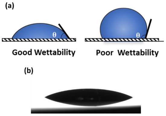 (a) Schematic of contact angle showing good and poor wettability and (b) picture of contact angle of one PAO drop on a textured surface.