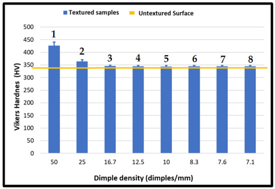 Vickers hardness results for textured (bars) and untextured (line) samples.