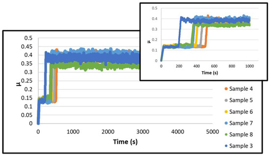 The important friction reduction when textured sample 2 was used can be clearly seen in the friction vs. time curves shown in Figure 9. From this figure, we can also see that textured sample 2 did not show the break-in period at the beginning of the tests, which is typically due to the initial removal of asperities. The absence of this high friction period at the beginning of the test has been previously reported [51,52] for other textured surfaces, where the texturing effect maintains low with constant fiction values. It was also very remarkable to see that when the continuous value of friction was represented for the other textured surfaces (Figure 10), all samples started the test with low friction values (no break-in period), and a sudden increment in friction was seen in all of these samples after some time. At the beginning of the test, there were still fresh dimples on the surfaces, and the friction coefficients remained low for a period of time probably due to the better retention of the oil in the textured surfaces [48]. As the test progressed, the textures created in samples 3–8 were not sufficient to retain a lubricant layer between the contacting surfaces, and asperity interactions took place, which eventually wore the dimples out. As a result, the metal surfaces started to perform as untextured surfaces, reaching higher friction values.
