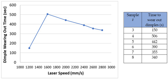 If only the first 1000 s (detail inset in Figure 10) are represented in the figure, we can confirm that the period of low friction was different for each sample. The dimple wear-out times for sample 3 to 8 are summarized in Figure 11. From Figure 10 and Figure 11, sample 3 (16.7 dimples/mm) showed the shortest time to wear the dimples out, probably due to the higher surface roughness of this sample amongst all the samples (Figure 6), which promoted the asperity interactions between surfaces. For samples with dimple densities ranging from 12.5 to 7.1 dimple/mm (sample 4 to sample 8), the wear-out time decreased with the decrease in dimple density, with the longest time duration for sample 4 and the shortest duration for sample 8.