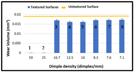 Wear volume on titanium for textured (bars) and untextured (line) samples.