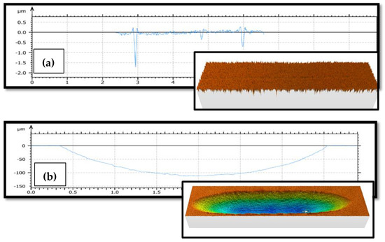 Two- and three-dimensional profiles of sample 2 (25 dimples/mm) and the untextured surfaces are summarized in Figure 14. Again, negligible wear with only superficial scratching was observed on the textured surfaces. Under the same experimental conditions, a deeper and wider wear track was obtained with the untreated titanium surface.