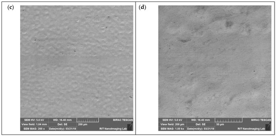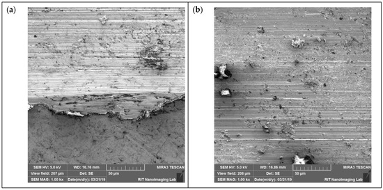 Figure 15 shows the SEM images of the wear tracks for the untextured sample and the textured sample with 25 dimples/mm dimple density (sample 2). In the untextured sample, a severe component of three-body abrasive wear was observed, where some of the wear particles responsible for the ploughing effect could still be seen in the image (Figure 15a,b). Plastically deformed material at the wear track edges was also observed on the untreated surface. On the other hand, for the sample with a dimple density of 25 dimples/mm, a very smooth and superficial wear track was observed, where no deformation of material or trapped hard particles could be seen.