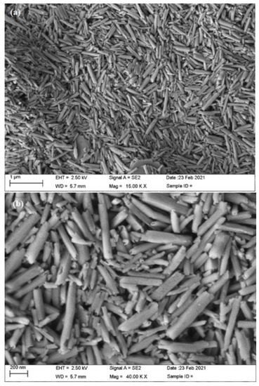 The morphology of the HNT NPs used for this study (SIGMA-ALDRICH Co., St. Louis, MO, USA) obtained by a field-emission scanning electron microscope (FE-SEM) ZEISS SIGMA VP (Carl Zeiss SBE, Thornwood, NY, USA) is shown in Figure 1. It can be observed that the shape of the HNTs is hollow tubular. The NPs safety data sheet can be found in [36]. The length and diameter of the nanotubes were measured by using more than fifty data points. The maximum and minimum lengths of the nanotubes were 677 and 125 nm, respectively. The average length of the HNT nanotubes was 303 nm with a standard deviation of 149 nm, obtained from the SEM images. The average diameter was 65 nm with a standard deviation of 19 nm, where the maximum diameter was 130 nm, and the minimum was 31 nm. A mid-oleic commercially-available sunflower oil was used as a base oil. The aspect ratio of the HNTs was 4.6. Table 1. shows the characteristics and properties of the sunflower oil, NPs, and specimens for the tribological tests.