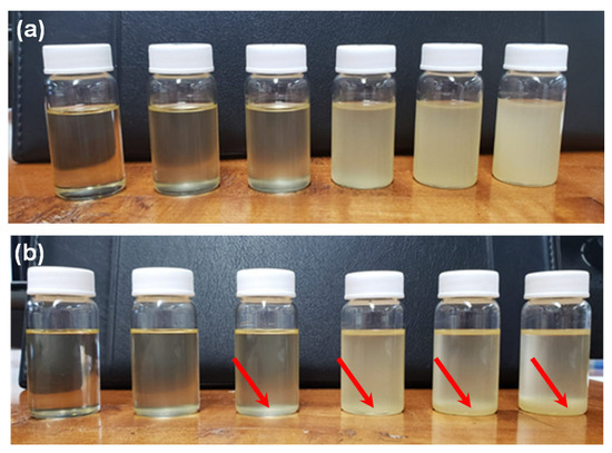 Images of prepared sunflower nanolubricants at 0, 0.05, 0.10, 0.5, 1.0, 1.5 wt.%: (a) 0 h after the sonication process, and (b) 7 days after sonication.