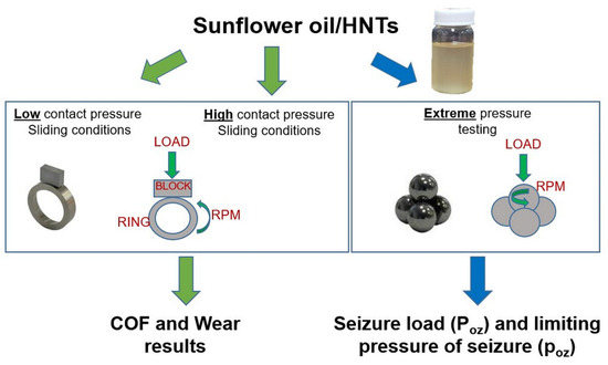 Tribological tests were performed on sunflower oil filled with HNTs under different conditions: low contact pressure, high contact pressure, and extreme pressures, as observed in Figure 3. These tests were conducted to determine the optimal HNT concentration according to the testing conditions, since various manufacturing processes are performed under a wide range of contact pressures and the purpose of this study was to propose sunflower nanolubricants for possible industrial applications.