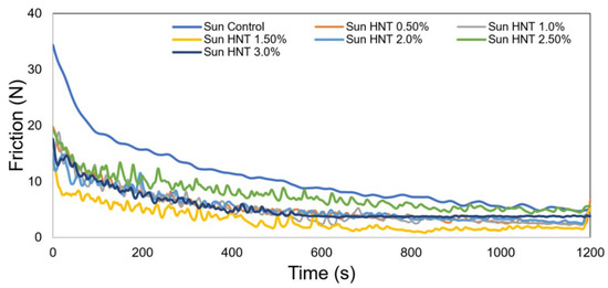 The tribological performance of sunflower oil was analyzed with and without the addition of halloysite clay nanotubes at different concentrations. In this case, the concentrations ranged from 0.5 to 3.0 wt.%, since at low pressures the lubricant film thickness is thicker and lower concentrations provide a negligible effect. The experimental data was collected from the block-on-ring experiments under the same test conditions for each sample. It was found that the addition of different concentrations of halloysite nanotubes had a great impact on decreasing the friction force during the tribological tests. Figure 4 shows the friction force recorded during the tribological tests lubricated with sunflower oil-based nanolubricants. The frictional force of sunflower base oil was initially 35 N whereas, with the addition of HNT nanoclay, the initial friction force decreased to less than 20 N. This could be attributed to the shape of the nanotubes. With the inclusion of NPs, the friction force was reduced, resulting in thin-film lubrication and a change in friction type from sliding to rolling. This result agreed with that of Peña-Parás et al. [42], who reported that the presence of HNT particles reduced the contact area.