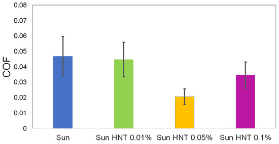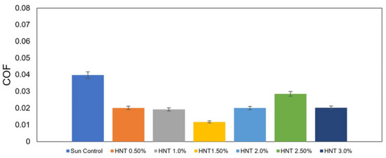 Figure 5 shows the COF results for the sunflower oil nanolubricants tested at a contact pressure of 218 MPa. It can be observed that the COF for the sunflower base oil was 0.0398 and, with the addition of HNT at different concentrations, the coefficient of friction was reduced significantly. The lowest COF was obtained with the 1.5 wt.% concentration, 70% lower than the COF obtained with the base sunflower oil. The maximum COF was obtained with the 2.5 wt.% HNT concentration among all the other sunflower nanolubricants. A previous study of sunflower nanolubricants with TiO2 and SiO2 NPs showed decreases in the COF of 94% and 78%, in comparison [17].