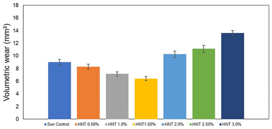 The mean volumetric wear for the blocks lubricated with sunflower oil-based nanolubricants is shown in Figure 6. In the case of sunflower oil without NPs, the volumetric wear loss was 9.013 mm3; with the addition of HNT at 1.5 wt.%, the volumetric wear was reduced to 6.425 mm3. We assume that the volumetric wear was reduced due to the rolling effect or load-bearing mechanism of HNTs [32]. From Figure 4, it can be observed that the volumetric wear increased with the increase in concentration from 2.0 to 3.0 wt.%. This could be attributed to agglomeration of the HNT NPs. The overall percentage of wear reduction for the best concentration was approximately 29% compared to the base sunflower oil. Cortes et al. [17] performed similar tribological testing with sunflower oil nanolubricants with 1.25 wt.% SiO2 (20–30 nm) and 1.0 wt.% TiO2 (18 nm) and obtained reductions in volumetric wear of 74% and 70%. The better results obtained by these spherical NPs compared to HNTs can be attributed to their very small size, which can provide a mending effect and form a protective film. Future work with sunflower nanolubricants should focus on combining HNTs and TiO2/SiO2 to take advantage of the tribological mechanism of each NP and study a possible synergistic effect. For our nanolubricants, after adding a HNT percentage of more than 1.5 wt.%, the volumetric wear loss started to increase and exceeded the base sunflower volumetric wear loss. Here, volumetric wear is reduced by adding NPs up to a specific concentration, as demonstrated by Cortes and Ortega [43], who found that adding 1.00 wt.% of CuO NPs to coconut oil reduced the volumetric wear by 33% compared to the base oil.