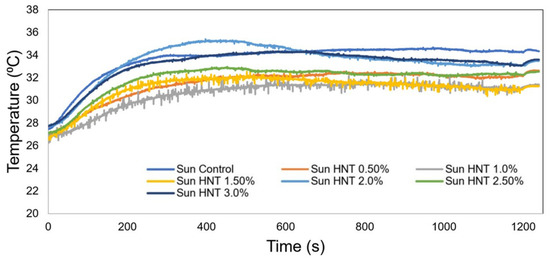 During the experiments, a temperature sensor was used to monitor the lubricant temperature. From the experimental data, it was observed that for the sunflower oil-based nanolubricants, the lubrication temperature decreased with the addition of halloysite nanotubes. The results of the lubrication temperature analysis are shown in Figure 7.