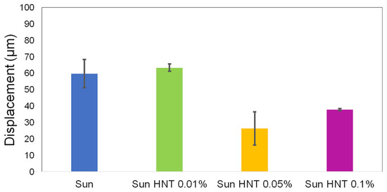 Figure 9 depicts the wear loss at high loads for sunflower nanolubricants with varying HNT concentrations. Similar to the values obtained for the COF (Figure 8), there is a trend of decreasing wear with increasing HNT content up to 0.05 wt.%. At this concentration, wear was lowered by 56%, whereas for 0.10 wt.% the improvement was 37%. The average wear obtained by the base sunflower oil and by the 0.05 wt.% HNTs were 60 µm and 26 µm, respectively; in comparison, a commercial graphite and triazine forging lubricant obtained a displacement of 25 µm [45].