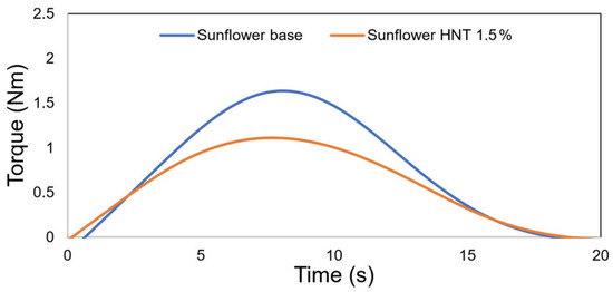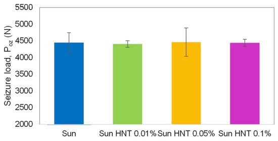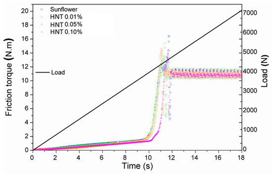 Figure 10 depicts the frictional torque at linearly increasing loads of 0–7200 N of sunflower nanolubricants obtained by the extreme pressure four-ball test. The seizure load (Poz) occurred between around 11–12 s for all lubricants, with average values of 4407–4466 N (Figure 11). For sunflower oil, Poz was ~4450 N; therefore, HNTs had a negligible effect on increasing this value. However, the effect of HNTs was observed in the WSD of the three lower steel balls; at 0.1 wt.% the WSD was 2.13 mm, compared to 2.50 mm for the base oil. As a reference, the previously-obtained value of Poz for distilled water is 810 N [46]; for commercially-formulated lubricants of oil-based synthetic, water-based semi-synthetic, and grease, these values are 2933 N, 3300 N, and 7200 N, respectively [33]. Therefore, the results obtained by the sunflower nanolubricants are comparable and in some cases superior to those obtained by commercial oil-based and water-based lubricants.