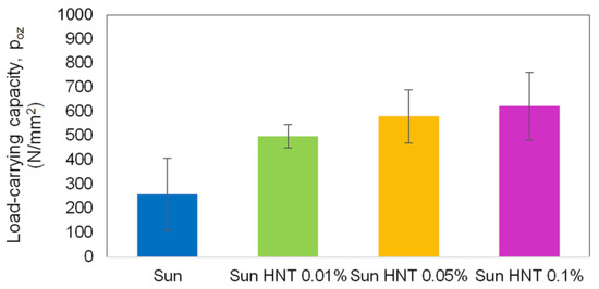 As shown in Equation (1), load-carrying capacity is calculated by taking into account the seizure load and the WSD of the three lower steel balls of the four-ball extreme pressure test. Figure 12 shows the increase in the load-carrying capacity of HNT–sunflower nanolubricants (N/mm2 = MPa). The addition of HNTs was able to provide a load-bearing effect, reducing the contact area, which in turn lowered the WSDs of the ball bearings and increased poz. For sunflower oil, poz was 259 MPa. For comparison, the reported poz values of distilled water, RzR rapeseed refined oil, and synthetic oil PAO8 are 260 MPa [46], 230 MPa, and 225 MPa [47], respectively. Additionally, the poz values of commercially-formulated lubricants of an oil-based synthetic, water-based semi-synthetic, and grease were 140 MPa, 210 MPa, and 407 MPa, respectively [33].