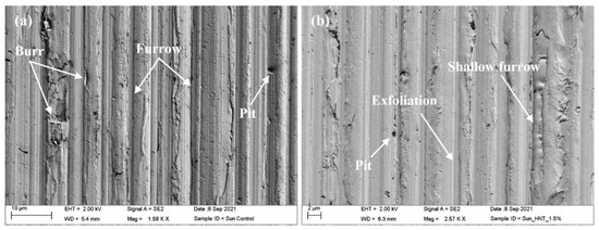 Figure 14 shows the SEM images of wear scars on the blocks after the wear tribological tests. In the case of sunflower oil, Figure 14a, it is observable from the wear scars that there are a large number of burrs and furrows. These burrs and furrows increase the friction between the sliding surfaces, thus resulting in a higher mass loss. Large pits and grooves were also found in the wear surface, which increased friction and wear between the sliding surfaces. Figure 14b shows the wear scar produced with the 1.5 wt.% HNT-reinforced sunflower oil. It presents a limited number of burrs and furrows, reducing the frictional force, and resulting in a low volumetric wear. Moreover, the exfoliation that occurs on the surface of the block with the 1.5 wt.% HNT-reinforced sunflower oil also helps to reduce the overall friction during lubrication. It was also noticed that there were fewer grooves on the surface of the used blocks when compared the to base oil used blocks. As it acts as a rolling contact bearing, the inclusion of HNT nanotubes has an impact on the sliding surface, reducing contact. This result indicates that halloysite clay nanotubes play an active role in the contact zone [20].