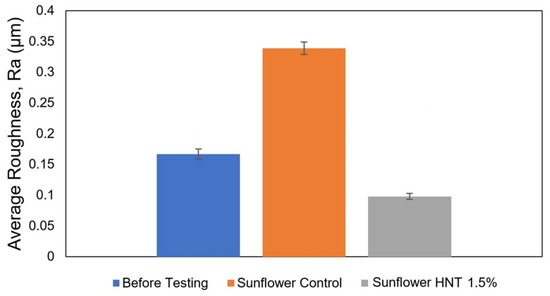The surface roughness of the blocks was measured before and after the tests lubricated with sunflower oil and the nanolubricants reinforced with HNTs at different concentrations. For the low contact pressure tests, the average surface roughness Ra values, acquired by the Mahrsurf M300C surface profilometer, are shown in Figure 15. The average roughness of the block used for the sunflower base oil was higher when compared to the untested specimen. The lowest average roughness was found in the wear scar of the block lubricated with 1.5 wt.% HNT–sunflower oil nanolubricant. It can be observed that the average roughness was decreased by 41.32% compared with the block lubricated with the base sunflower oil. This is due to the higher concentrations of palmitic and oleic acids, which help with friction and roughness due to the double bonds in their chemical compositions. For the high contact pressure tests, the Ra values of sunflower oil, 0.01, 0.05, and 0.10 wt.% HNTs were 0.48 µm, 0.46 µm, 0.37 µm, and 0.45 µm, respectively. Therefore, there was a maximum reduction of 22%. For the extreme pressure test (Figure 16a–d), HNTs were also able to reduce the surface roughness due to the reduced real area of contact. Figure 16a shows the higher amount of debris for the base oil which adhered to the surface providing an Ra of 2.3 µm. With 0.01, 0.05, and 0.10 wt.%, the Ra values were lowered to 0.81 µm, 0.77 µm, and 0.46 µm. Peña-Parás et al. [32] found similar results, in which lower roughness values delayed the loss of the lubricant layer film thickness, explaining anti-wear and friction reduction.