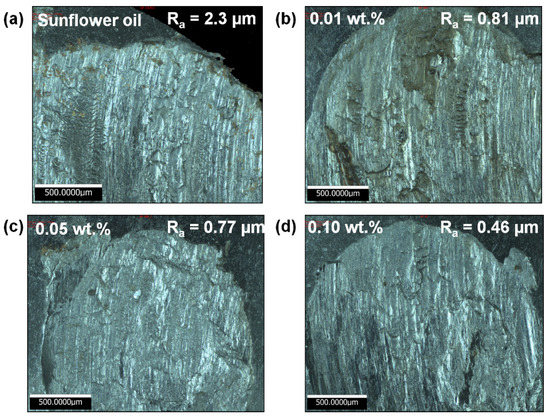 Average surface roughness of ball bearings after the extreme pressure test lubricated with (a) sunflower oil and sunflower oil reinforced with HNTs at (b) 0.01, (c) 0.05, and (d) 0.10 wt.%.