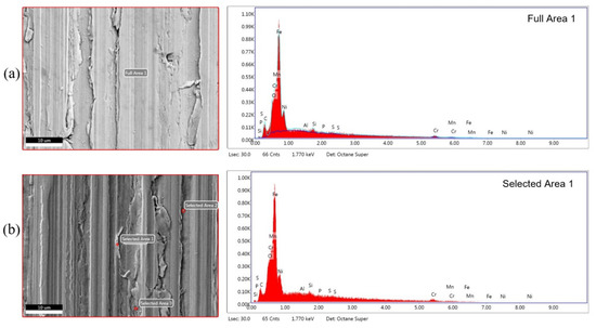 SEM images of the wear scars and the related EDS elemental analysis of selected areas for specimens tested with sunflower oil without nanoparticle additives and with HNT nanoparticles at 1.5 wt.% are shown in Figure 17a,b, respectively. EDS analysis was performed to compare the Al and Si levels on the wear track to indicate the presence of HNT nanoparticles. However, for these two specimens, the EDS spectra as shown in Figure 17a,b are almost identical, presenting peaks for the elements contained in the AISI 304 stainless steel. There was no trace of HNT nanoparticles on the wear scar, as shown in Table 2, indicating that HNTs did not form a protective film due to their dimensions—which are larger than the surface roughness of the samples. In this case, a rolling effect or load-bearing mechanism is proposed. A similar behavior was observed in a previous study with mineral oil and synthetic fluid lubricants reinforced with HNTs tested at a contact pressure of 500 MPa [42].