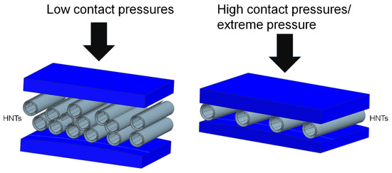 Graphic representation of the proposed tribological mechanism of HNTs at low contact pressures and high contact pressures/extreme pressure.