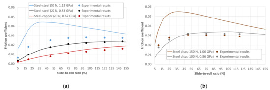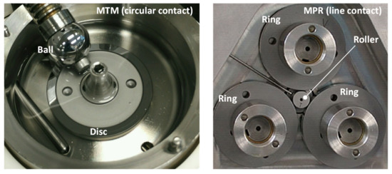 Friction coefficient measurements were performed on the MTM and MPR tribological test rigs developed by PCS Instruments (www.pcs-instruments.com, accessed on 1 May 2022), in order to compare the results with the models for circular and line contacts. In the MTM, the ball-on-disc configuration was used, with 9.525 mm radius steel balls and flat discs of steel and copper. In the MPR, a triple contact between steel discs was tested, consisting of three identical rings and a central roller, with radii of 27 and 6 mm, respectively, and with a contact length of 1 mm in the transverse direction. The setup in the MPR allows an evenly distributed normal load along the three contacts.