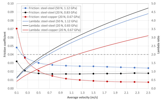 It is worth noting that Stribeck [46] introduced the lambda value as an indicator of the lubrication regime. The Hersey number [47] may be used alternatively, which is defined as the product of viscosity and velocity, divided by pressure.