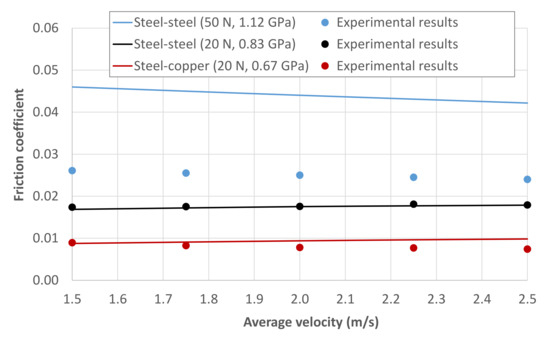 As previously indicated, the steel-copper contact at 20 N in the MTM results in a maximum Hertz pressure of 0.67 GPa, which, for steel-steel specimens, increases to 0.83 GPa at 20 N and 1.12 GPa at 50 N. Comparing the results of the three tests for high average velocities, i.e., in the EHL regime, a friction increase with Hertz pressure is shown in Figure 3, mainly due to the piezoviscous response of the lubricant [60]. Furthermore, as the average velocity decreases and mixed lubrication is reached, the steel-copper contact gives rise to a more pronounced increase in friction, due to its lower lambda ratio and consequent earlier film rupture, in line with the results in references [61,62].