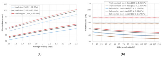 The film thickness estimates corresponding to the friction results in Figure 4 and Figure 5 are compiled in Figure 6a,b, respectively. It can be seen that, even for low SRRs, the film thicknesses are lower than those obtained for the Newtonian and isothermal approach, which is in line with references [28,37]. The differences become greater both when increasing the average velocity at fixed SRR and when increasing the SRR at fixed average velocity, since both cases imply a proportional rise in the sliding velocity and more significant shear-thinning and thermal effects. In the results of Figure 6, the film thickness values are always more than twice the combined roughness, which ensures EHL conditions and negligible influence of the surface asperities on the friction coefficient [48,49,50]. Moreover, the MTM allows the electrical contact resistance (ECR) between the specimens to be measured during the tests. The ECR reading was usually 100%, which is indicative of full separation between the specimens.