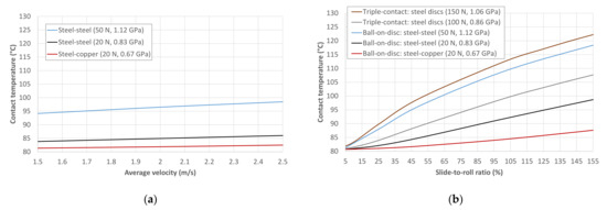 The friction coefficient remains practically constant with the average velocity, as shown in Figure 4. In both theoretical and experimental results, a slight decreasing trend is found in the test at the highest Hertz pressure, which can be attributed to thermal effects [63]. The estimates of the contact temperature for the results in Figure 4 are presented in Figure 7a, where higher temperatures are observed as the pressure increases. However, the SRR value of 50% is relatively low and, consequently, the thermal effects are not very significant in any of these tests.