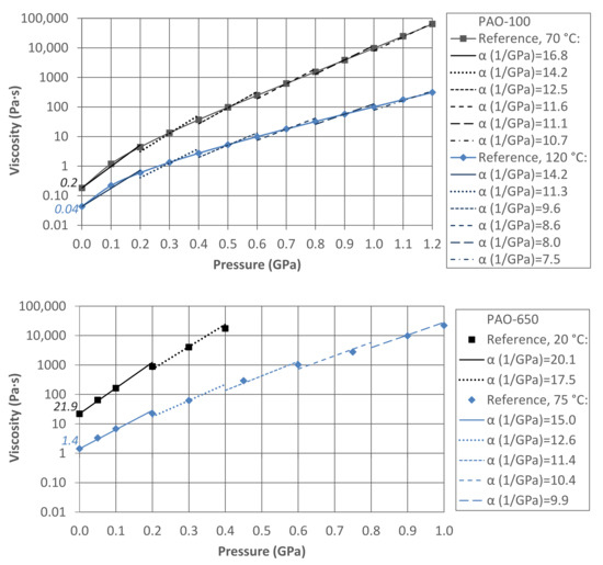 Hence, the reciprocal asymptotic isoviscous pressure coefficients can be computed using Equation (2). The results for the PAO-100 are 17.5 GPa−1 at 70 °C and 14.0 GPa−1 at 120 °C, whereas for the PAO-650 they are 20.1 GPa−1 at 20 °C and 14.8 GPa−1 at 75 °C. In addition, the variation of the pressure-viscosity coefficient shown in Figure 8 is obtained by fitting Equation (6) to the low-shear viscosity of these lubricants in pressure intervals of 0.2 GPa. The pressure-viscosity coefficient decreases with increasing pressure and moves away from the reciprocal asymptotic isoviscous pressure coefficient. If this variation is not taken into account, there is a general tendency to overestimate the viscosity and consequently also the friction coefficient. This issue becomes quite significant at high Hertz contact pressure, as can be seen in the results for the PAO-6 in Figure 4 and Figure 5.
