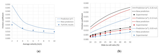 Influence of the pressure-viscosity coefficient on the prediction of the friction coefficient: (a) Steel-steel line contact lubricated with PAO-100 at Tb = 70 °C, pH = 1 GPa and SRR = 100%; (b) Steel ball on glass disc, lubricated with PAO-650 at Tb = 75 °C, pH = 0.53 GPa and um = 0.03, 0.13 and 0.26 m/s. (For more details, see references [65,66]).