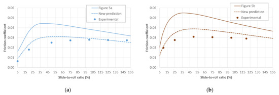New prediction for the results at highest pressures in Figure 5: (a) Steel ball on steel disc contact lubricated with PAO-6 at Tb = 80 °C, um = 2 m/s and W = 50 N (pH = 1.12 GPa); (b) Triple contact between steel discs lubricated with PAO-6 at Tb = 80 °C, um = 2.5 m/s and W = 150 N (pH = 1.06 GPa).