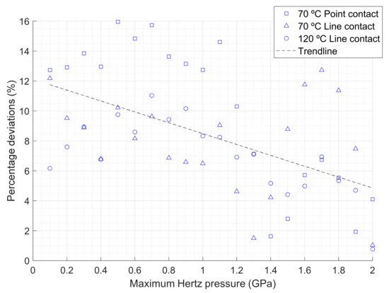 Hence, in this article, we prefer to keep the formulation based on the simple exponential law, fitting the pressure-viscosity coefficient to the low-shear viscosity data in the pressure interval that includes the maximum Hertz pressure. The deviations between the friction estimates thus obtained for the PAO-100 and those calculated by numerical integration of the shear stress, Equation (8), for the Tait-Doolittle model (10) and the Hertz pressure distribution are presented in Figure 12. The comparison is approximately independent of the sliding velocity and film thickness, as these parameters affect the generalized viscosity in a similar way in the two friction calculation methods. The Hertz pressure values used to obtain this figure include the midpoint and the endpoints of each interval where the pressure-viscosity coefficient has been fitted in Figure 8. Similarly, higher Hertz pressures are also considered in Figure 12 for a more complete analysis.