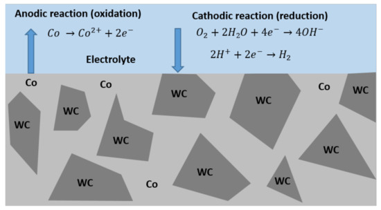 Cemented tungsten carbides have a wide range of applications where the tribocorrosion process is often present. Components are widely used in cutting, oil and gas, tunnelling, and mining industries in which these materials are submitted to extremely severe conditions that affect their service life, such as high pressure, temperature, and different corrosive media at different pH that can cause failure in early stages [13,14]. Due to the characteristics of these composite materials, usually composed of hard WC grains in a soft metal matrix binder (e.g., Co, Fe, and Ni), different tribological mechanisms are associated. The different electrode potential of hard WC grains, acting as the cathode, and the soft binder phase, acting as the anode, leads to the formation of microgalvanic couples between these phases in many aqueous environments, causing corrosion [15,16,17,18]. This phenomenon is illustrated in Figure 1 for the WC-Co composite. However, it has been reported [19,20,21,22] that Ni-based binders significantly improve the corrosion and oxidation resistance of the hardmetal components.