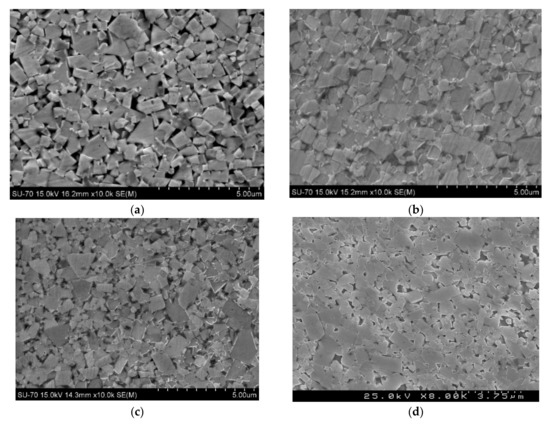The specimens with 20 mm diameter and 7 mm thickness were ground and polished until mirror-like with a Ra (Roughness average) < 0.05 µm. Most of these composites were already investigated for abrasive and sliding wear resistance under dry conditions [28,29], and the production route is described elsewhere [28]. SEM micrographs of the different specimens before tribological testing can be seen in Figure 2.