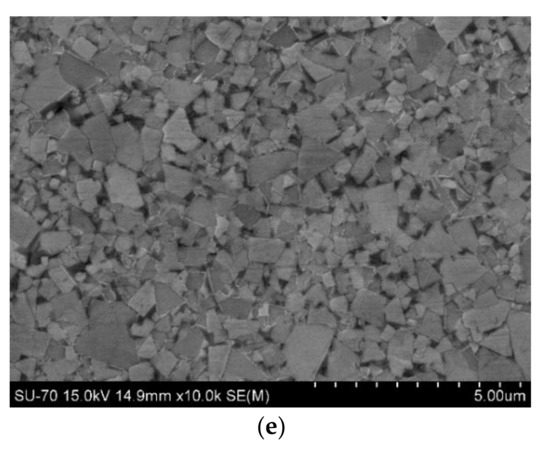 SEM micrographs of the different specimens before being subjected to the tribological tests: (a) WC-Co, (b) WC-Ni, (c) WC-NiCr, (d) WC-NiMo, and (e) WC-NiCrMo.