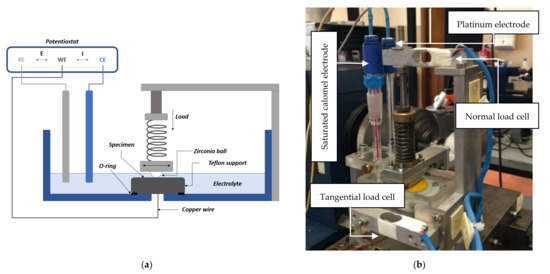 The different test specimens were placed on Teflon support and then coupled to the triboelectrochemical equipment. There is a small orifice on this apparatus to allow the passage of the insulated copper wire. To avoid electrolyte leakage, an O-ring was placed between the sample holder and the recipient. The reference electrode was a saturated calomel electrode (SCE), and the counter electrode was a platinum wire, as can be seen in Figure 3b.