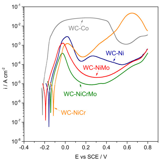 Analysing the anodic branches at the right side of the polarization curves, it is possible to conclude that the WC-Co specimen presented a completely different behaviour than the other Ni-based binder composites (WC-Ni, WC-NiCr, WC-NiMo, and WC-NiCrMo). For the WC-Co specimen, a small anodic overpotential was sufficient to produce a noticeable increase in the current density, followed by a large passive region close to the corrosion potential. Regarding Ni-based binder composites, larger overpotentials had to be applied to reach similar current densities. Furthermore, as the potential increases, there is an increase in current up to 0.0 VSCE due to the binder dissolution. For potentials of the order of −0.15 VSCE, a Ni oxide protective film is formed, as can be deduced by the small plateaus. There is a rupture of the film for more positive potentials due to the chloride ions in the solution, and an increase in current is observed. For potentials of 0.50 to 0.7 VSCE, a second plateau is observed, mainly for the WC-Ni specimen, except for the WC-NiCr specimen. This second plateau is related to the formation of tungsten oxides [30].