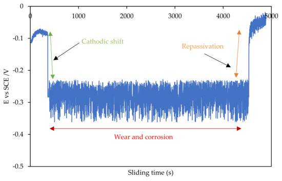 Three regimes are easily identifiable. Once the test started, a significant drop in potential, known as cathodic shift, was observed. During the trial, fluctuations in the potential were registered, possibly due to the constant breakdown and formation of the protective oxide covering the WC grains. Finally, when the sliding stopped, the potential increased again, suggesting repassivation of the worn area.