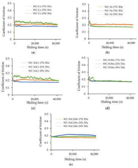 Evolution of the coefficient of friction (COF) with the sliding time for tested specimens rubbing against the zirconia ball with different applied loads (17, 23, and 29 N) and frequency of 3 Hz in a 0.5 M NaCl + 0.05 M HCl solution (lubricated conditions): (a) WC-Co, (b) WC-Ni, (c) WC-NiCr, (d) WC-NiMo, and (e) WC-NiCrMo.